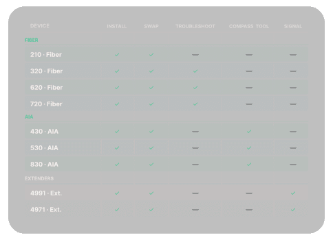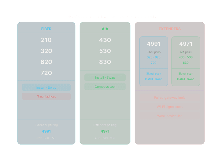 The feature set varies by device type. Troubleshooting flows are Fiber-specific. The compass is AIA-only. Signal scanning belongs to extenders. The shared framework accommodates all of this without any of it surfacing in the wrong device's experience.