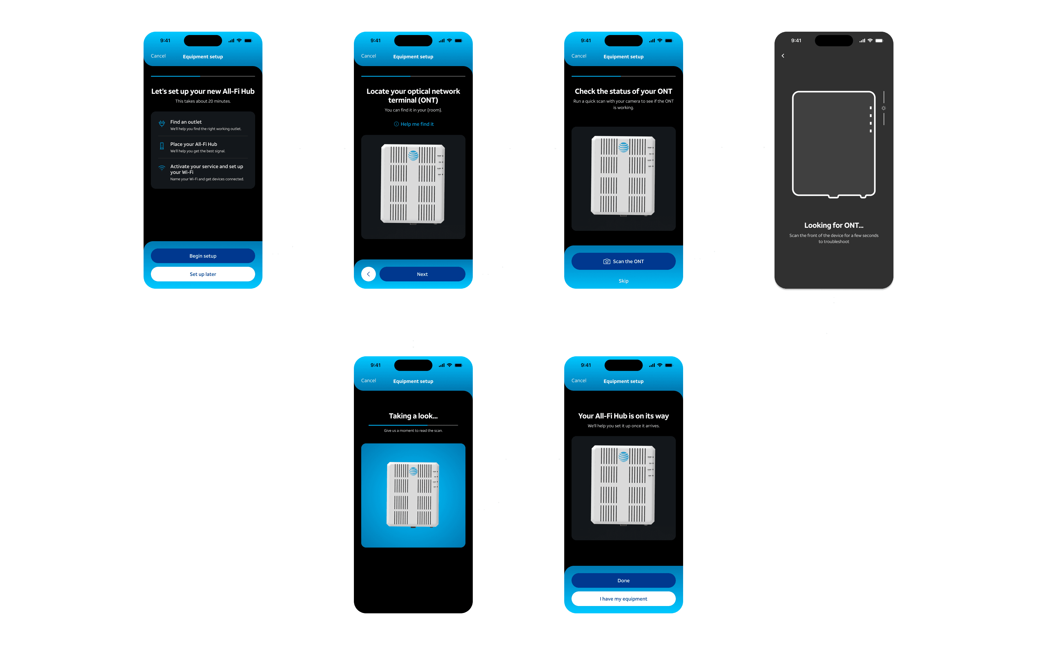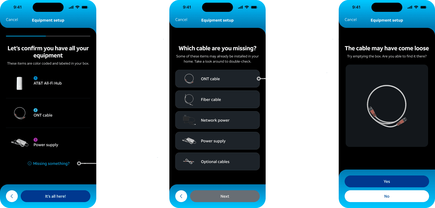 Marketing, product, engineering, and AT&T's hardware teams all had input on how the install flows should work. I spent a lot of time in that space, understanding what was driving each perspective and figuring out where to align and where to hold the line. Getting that balance right is what kept the product moving without the design getting eroded in the process.