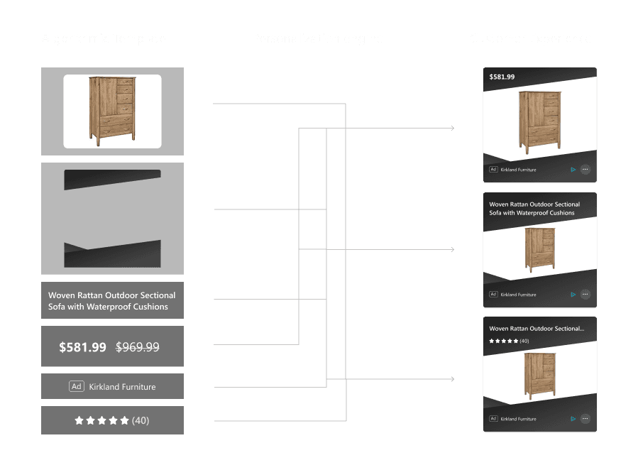 The real design challenge wasn't any individual ad, it was the rules the algorithm would use to assemble millions of them. Every layout decision had consequences at scale. A component that worked for a short title and a square image had to also work for a long title, a portrait image, a discount price, and a missing description, all without designer intervention.