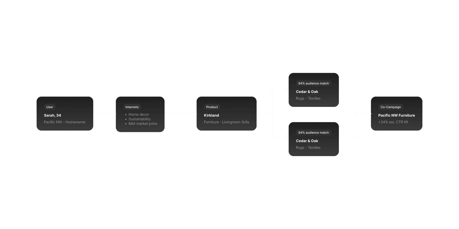 Cross-brand campaigns matched by shared audience signals, zero category overlap.