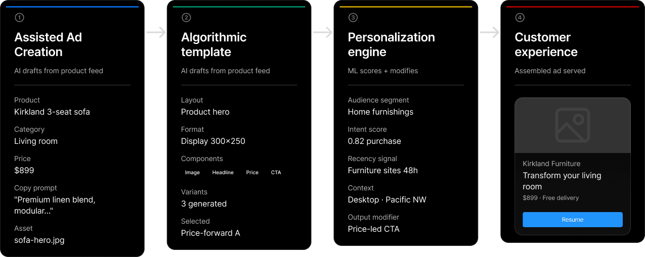 Every user saw the same static ad regardless of context, behaviour, or intent. Templates were rigid and assembled without any signal from the person seeing them, making them easy to ignore and hard to optimise meaningfully.